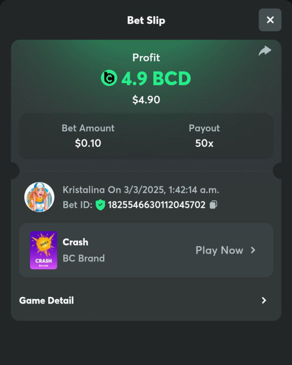 2. Easy 1. Deposit Txid: 4434113e293eb472a7b171d17fbe54cbfb34631824705869716f789ec0040181 2. Instagram: @LincesaMdq 3. Instagram Post: https://www.instagram.com/p/DHXgr4JspCP/?igsh=ZWgwenpqYXVreTF 4. Twitter: @Kristalinauwu 5. Like, retweet & tag: @Kristalinauwu https://x.com/Kristalinauwu/status/1901728054969274750 6. Follow BCGame Facebook: Gisela Gall 7. Limbo: https://bc.co/game-detail/1825513481832927011 8. Sports bet: Ticket ID: 2513820866270339253 9. Arabian Secret: https://bc.co/game-detail/1825439374915515681 10. Sugar Fiesta 1000: https://bc.co/game-detail/1825441146495751971 11. 2FA activated: Medium 1. Deposit TxID: 4d707ead402ff5771e270374a5fc42f5798fdc6bd13d6bf975996a5316cb53ff TxID: 39d9776a52287c2bdc8bea45c1a751ae618ef4976ed8907766ce39ac0603937f 2. Crash: https://bc.co/game-detail/1825546630112045702 3. Plinko: https://bc.co/game-detail/1825430753182757665 4. Roulette: https://bc.co/game-detail/1825527742035924514 5. Starshine Princess 1000: https://bc.co/game-detail/1825598330617384993 6. Stellar Rush: https://bc.co/game-detail/1825601183186807841 7. Keno: https://bc.co/game-detail/1825612623614982433 8: Poker Ways: https://bc.co/game-detail/1825547398747784483 9. Wukong: https://bc.co/game-detail/1825595350268898850 10. Lottery and Porsche tickets: 11. Sports bet Combo Ticket ID: 2512055034057994476 Hard 1. Wheel: https://bc.co/game-detail/1825529693239491107 2. Crash: https://bc.co/game-detail/1825774085023770502 3. CoinFlip: https://bc.online/game-detail/1825620056214876707 4. Stellar Rush: https://bc.co/game-detail/1826242186137422626 5. Plinko: https://bc.co/game-detail/1825459660201698850 6. Limbo: https://bc.online/game-detail/1826864347105905955 7. Hashdice: https://bc.online/game-detail/1826862839661034018 8. Sea of Olympus 1000: https://bc.co/game-detail/1825539068560977186 9. Gold of Olympus: https://bc.online/game-detail/1826344599486243619 10. Duck Hunter: https://bc.co/game-detail/1825605420251285539 11. Sports bet combo Ticket ID: 2513187573116055908